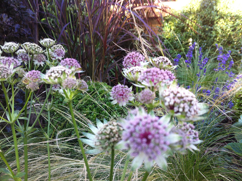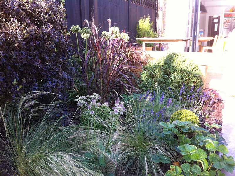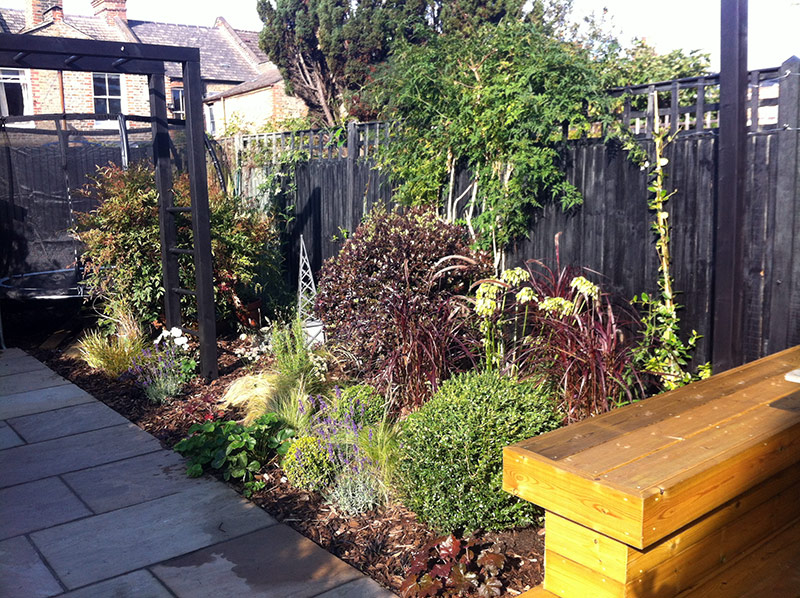 Rachel's GardensThis contemporary garden in Balham now offers itself as another outside room providing a great entertaining area leading from the large kitchen doors with inbuilt seating. Raj Green Sandstone paving leads to the shed and trampoline, leaving very generous planting beds either side. The planting is a mix of evergreen shrubs and climbers. Additional perennials and bulbs give all year round interest.