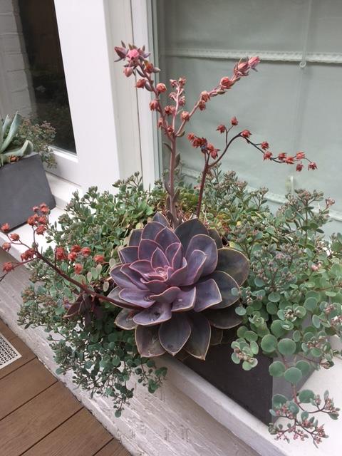 The other pots were carefully selected. The planting is a mix of evergreen climbers and box balls with bulbs and perennials to give all year round interest.