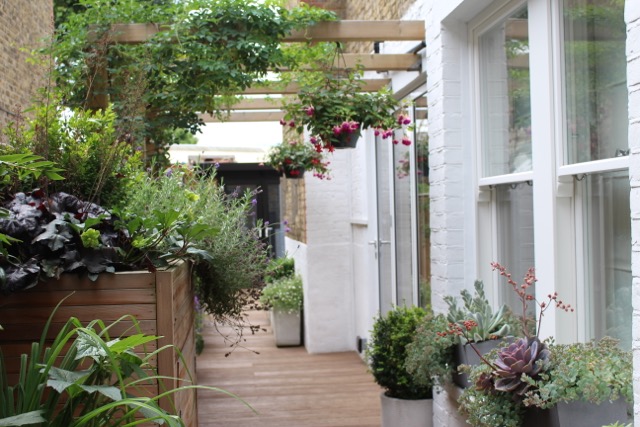 The clients were keen to maximize the long narrow side return garden which their kitchen opened out on to and is slightly overlooked. We installed millboard composite decking as this has longevity. We made a bespoke contemporary pergola with stainless steel tension wires running in between which will support climbers and give it a nice finish. Some of the planters were bespoke made from soft wood and cedar clad and one also doubled up as a storage unit.
